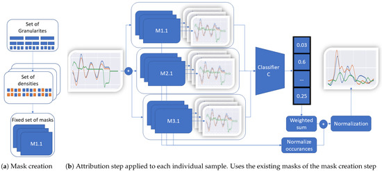 TimeREISE. Shows the two steps required to use TimeREISE. (a) shows the generation based on a set of different granularities and densities. The granulariy defines the number of slices and the density of the number of perturbed slices within a mask. (b) shows a set of masks (M1.1 to M3.x) applied to the input using an exchangeable perturbation function. The default perturbation is an element.wise multiplication. The masked input is passed to a classifier and the classification score is retrieved. The classification score is multiplied (*) by the masks and normalized by the number of feature occurrences. Finally, the attribution is normalized based on the number of occurrences of each point.