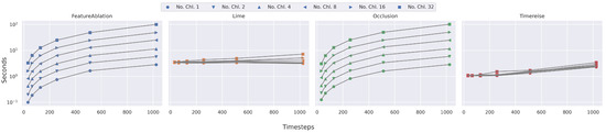 Runtime Parameter dependency. Shows the runtime on synthetic data with different number of timesteps and channels. IntegratedGradients and GuideBackprop are excluded. The runtime of FeatureAblation and Occlusion increase dramatically with the longer sequences. TimeREISE and Lime show a stable runtime.