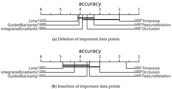 Deletion & Insertion. Critical difference diagram showing the average rank of each attribution method across all datasets. The ranking is based on the AUC using accuracy. Perturbation-based approaches achieve better results on the deletion and insertion test. TimeREISE shows a superior performance for both tests.