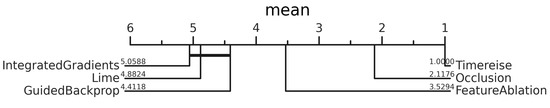 Sensitivity. A critical difference diagram showing the average rank of each attribution method across all datasets. The ranking is based on the average Sensitivity. Perturbation-based approaches show superior performance. The horizontal bars show the groups that can be concluded based on the rank of the methods. They clearly highlight the high and low performing sets.