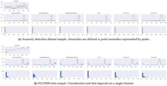 Attribution Maps. Shows the attribution maps for a single sample. The first row shows the original sample. The second row shows the actual attribution and the third row shows the histogram of the attribution scores within the given map. Generally, a large amount of low values in the histogram relates to a good separation between relevant and irrelevant features. (a) shows an anomalous sample in which the green peak corresponds to the anomalous signal part. Overall the attributions look similar except that TimeREISE is smoother compared to the other methods.