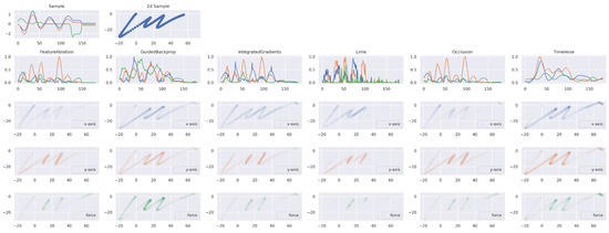 Explainable Attribution. The first row shows the time series of the character example ‘m’. The right plot corresponds to the back transformation to the original 2d space. The second row shows the attribution results for each method. The subsequent rows show the importance applied to the character for the horizontal and vertical direction as well as for the force. TimeREISE provides a smooth attribution map and assigns importance to the force channel. Besides TimeREISE, only GuidedBackprop highlights the importance of the force channel.