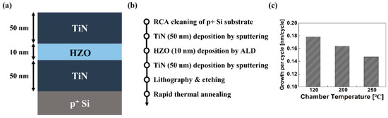 (a) Illustrated cross-sectional view of the fabricated TiN/HZO/TiN capacitor, and (b) its fabrication process flow. The HZO layer were deposited under three different temperatures in chamber, i.e., 120 °C, 200 °C, and 250 °C. (c) Growth per cycle of HZO film for three different chamber temperatures. Note that the growth per cycle is decreased with increasing the chamber temperature, which is due primarily to the decreasing contribution of surface exchange reaction [13].