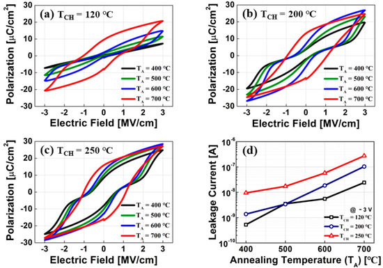 Measured polarization vs. electric field of TiN/HZO/TiN capacitor in which the HZO layer was deposited at the chamber temperature of (a) 120 °C, (b) 200 °C, and (c) 250 °C. Note that four different annealing temperatures (TA = 400~700 °C) were used for better implementing the ferroelectric characteristics of the HZO layer. (d) Measured leakage current-vs.-annealing temperature for three different chamber temperatures. Note that the leakage current was measured with the voltage of −3 V across the ferroelectric capacitor.