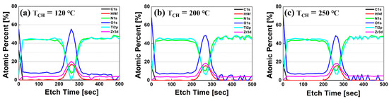 Measured XPS depth profiles of TiN (50 nm)/HZO (10 nm)/TiN (50nm) capacitor, which was fabricated at three different chamber temperatures: (a) 120 °C, (b) 200 °C, and (c) 250 °C.