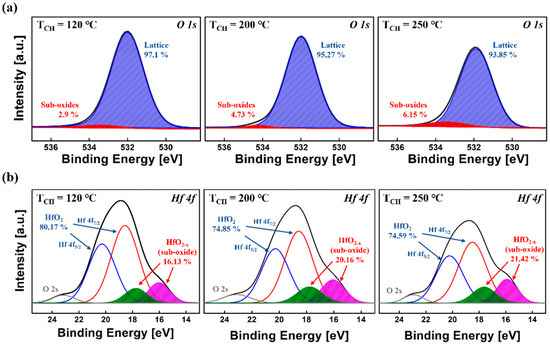 It was observed that the percentage of sub-oxide bonding is increased at a higher TCH (see Figure 4a). This also indicates that the ratio of VO increases. In other words, the oxygen should move from the HZO layer to the electrodes to make the interfacial layer, and thereby, the VO in HZO film is increased [17]. Hence, the increased VO means that the larger amount of oxygen has moved toward the interfacial layer. In addition, in the XPS for Hf 4f spectra, it was confirmed that the sub-oxide means the oxygen vacancy in the HZO layer [19]. As shown in Figure 4b, it was observed that the ratio of sub-oxide in Hf 4f spectra is increased when TCH is increased, which leads to a higher VO. In summary, the ratio of oxygen in the HZO layer becomes smaller at a higher TCH, which is closely associate with the amount of VO. A higher TCH would make the ratio of VO higher. This is well agreed to the increase in leakage current at a higher TCH because of the increased VO (see Figure 2d).