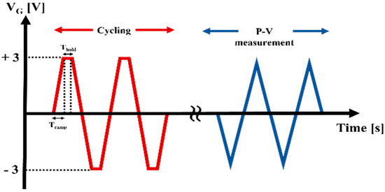 The endurance (especially, affected by an electric field cycling) in TiN/HZO/TiN capacitors was investigated. Figure 6 shows the pulsing scheme for evaluating the endurance of the capacitors. The electric field cycling was completed with using a trapezoidal pulse, and the number of cycling was applied up to 108. After the cycling pulses were applied, a triangular pulse was applied to measure the P-V characteristic of the capacitor. Note that both pulses have the same peak amplitude of 3 V. The P-V characteristic of each capacitor was compared to each other (see Figure 7).