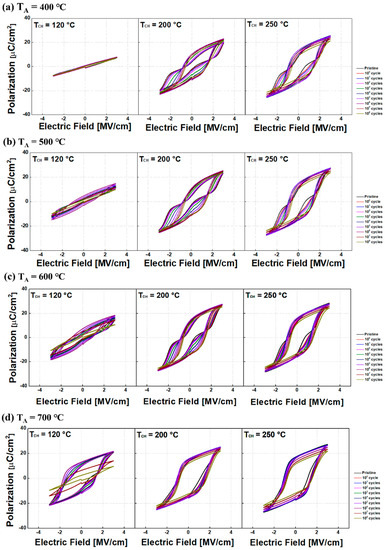 The remnant polarization (Pr) of each HZO capacitor in pristine state is as follows: In case of TCH of 120 °C, Pr of 0.28 µC/cm2, 1.17 µC/cm2, 2.68 µC/cm2, and 17.21 µC/cm2 was observed for TA of 400 °C, 500 °C, 600 °C, and 700 °C, respectively. In case of TCH of 200 °C, Pr of 5.66 µC/cm2, 6.88 µC/cm2, 13.43 µC/cm2, and 26.37 µC/cm2 was observed for TA of 400 °C, 500 °C, 600 °C, and 700 °C, respectively. Finally, in case of TCH of 250 °C, Pr of 16.38 µC/cm2, 20.46 µC/cm2, 25.3 µC/cm2, and 31.8 µC/cm2 was observed for TA of 400 °C, 500 °C, 600 °C, and 700 °C, respectively. Regardless of TCH, it turned out that Pr was increased with increasing TA. For a given/identical TA, Pr can be improved with higher TCH. This is primarily because the amount of ferroelectric phase was increased with increasing either TA or TCH [2,9].