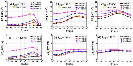 Measured representative ferroelectric characteristics (i.e., remnant polarization (2Pr) and/or coercive electric field (2Ec)) versus cycles, for given three different chamber temperatures, (a,d) 120 °C, (b,e) 200 °C, and (c,f) 250 °C with four different annealing temperatures (TA from 400 °C to 700 °C). The yellow−colored circle indicates the max point of 2Pr.