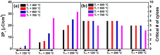 (a) Maximum remnant polarization (2Pr) and (b) critical number of cycles at which fatigue begins for given three different chamber temperatures, 120 °C, 200 °C, and 250 °C, with four different annealing temperatures (TA from 400 °C to 700 °C).