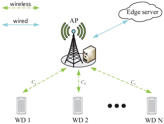 We consider an MEC network composed of one edge server, one wireless access point (AP), and N WDs, denoted as , as shown in Figure 1. The AP and the edge server are connected by optical fiber, whose transmission delay can be ignored. Each WD has one task that needs to be processed locally or be offloaded to the edge server through the AP. Without loss of generality, each WD needs to execute one prioritized computing task with a specific task weight. Denote as the task weight of , whose value changes in the countable set depending on the specific task category. An MEC task scenario is considered different from another one if at least one task’s weight is different. Each WD can decide whether to offload its tasks to edge servers or compute locally by the device itself. Denote as the offloading decision. Specifically, indicates that the offloads its task to the edge server and means its task is processed locally.