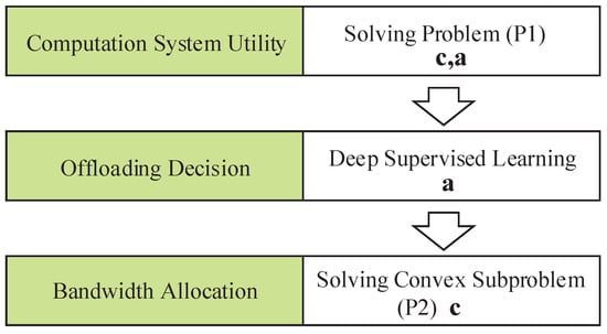 Here, the constraints (8) and (9) mean that the bandwidth allocated to all WDs is non-negative, and C limits the total bandwidth. Since the constraints on the offloading decision and bandwidth allocations are decoupled, we decompose problem (P1) into an offloading decision subproblem and a bandwidth allocation subproblem (P2), as illustrated in Figure 2.