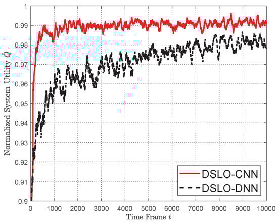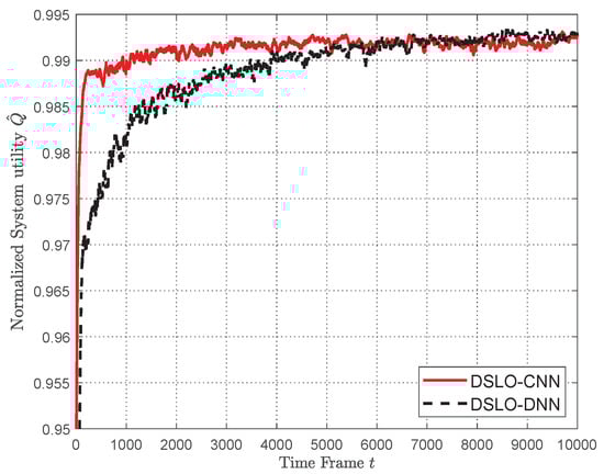 which is a ratio between the enumerated optimal offloading action and the one generated by the evaluated algorithm. Both DSLO-CNN and DSLO-DNN converge to a normalized system utility . With regard to the convergence speed, DSLO-CNN only takes 1000 time frames, while DSLO-DNN takes 5000 time frames. Therefore, the DSLO-CNN algorithm can quickly converge and achieve approximately optimal convergence .