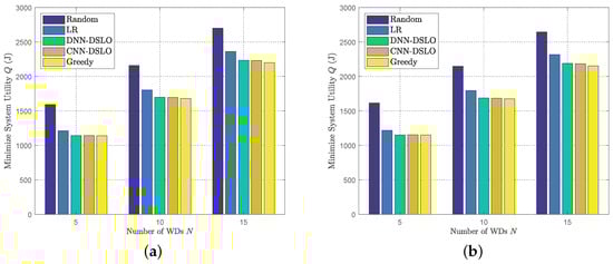 In Figure 7, we compare the system utility performance of different offloading algorithms under the varying numbers of WDs. The MEC task scenarios are different due to the different number of WDs. For fairness, we have considered two different MEC scenarios: and , whose weight factors are evenly distributed. For each WD, we give weight factors data in Table 3. Compare and with the data at the same position. For example, when N = 15 and CNN is adopted in the algorithm, the minimize system utility Q obtained, respectively, is 2230 and 2183, which is a small gap. To evaluate the extreme performance, both DSLO algorithms have been trained with 5000 independent workloads until convergence. Each value is an average of over 1000 independent test data samples in Figure 7. For different MEC scenarios, both DSLO-DNN and DSLO-CNN achieve approximately optimal performance as the Greedy algorithm and are significantly better than LR and Random algorithms. Under the condition of the same algorithm, only changing the task weight (priority relationship) between WDs will not produce a big difference in the results.