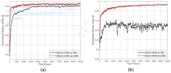 In Figure 8, we evaluate the effect of BN in both DSLO algorithms. BN greatly improves the convergence performance of DSLO in metrics of both convergence speed and the optimal system utility. As shown in Figure 8a, with the BN structure, the training time of DSLO-CNN reduces from 4000 time frames to 1000 time frames. As shown in Figure 8b, models that do not contain BN layers have a high tendency to fall into local optima in the training phase.