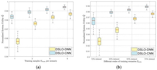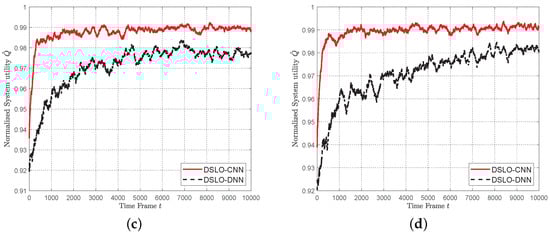 In Figure 10, we evaluate the convergence performance of DSLO with different scales of training scenarios. As shown in Figure 10a, when , we randomly choose 103 MEC scenarios out of 1024 scenarios to build the training dataset. Other system parameters are the same as the ones in Figure 9. It follows that there are only 206 training samples when . With such a few training samples, DSLO-CNN achieves a normalized system utility after convergence. As shown in Figure 10b, when , the DSLO-CNN algorithm converges within with . In Figure 10c,d DSLO-CNN converges faster and achieves a more stable performance with the increase of training scenarios. In all these cases, DSLO-DNN converges much slower than DSLO-CNN. Hence, the proposed DSLO-CNN is suitable for dynamic MEC scenarios with few training samples.
