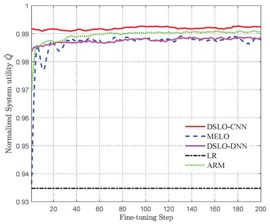 Before fine-tuning the training, the models were trained with a sufficient number of samples, where as well as . It is worth mentioning that the input of the MELO algorithm model does not contain weight information, and other parameters are set in the same way as the DSLO algorithm. To avoid chance, we use the average value of the fine-tuning test in 10 MEC scenarios as the actual test effect. As shown in Figure 12, the LR algorithm produces a constant normalized system utility value . The MELO algorithm converges to the same performance as DSLO-DNN in 30 fine-tuning steps, resulting in a normalized system utility value over 98.5%. The ARM algorithm is implemented based on CNN and generates a normalized system utility value , which is greater than MELO and DSLO-DNN. However, the normalized system utility value generated by DSLO-CNN is always greater than 99%. Hence, DSLO-CNN makes full use of the weight information and can achieve better model initialization parameters than other computational offloading algorithms with a small number of training samples. The algorithm can be quickly adapted to new MEC scenarios.