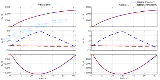 The reference trajectory and the missile position time history are shown in Figure 2 for flight parameters evaluated directly from the equations of motion or obtained from the IMU. It can be seen from the plot that an offset in the lateral position was obtained for the final position; however, this was considered acceptable as the error was of just a few meters. When the IMU was not used, i.e., assuming an ideal system, this offset was not observed.