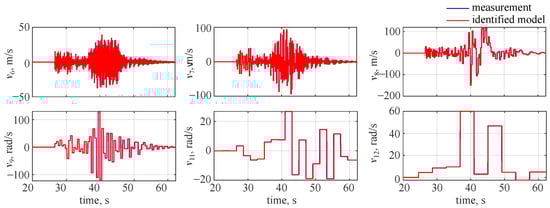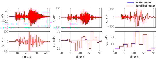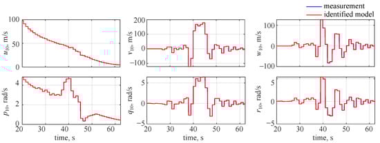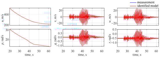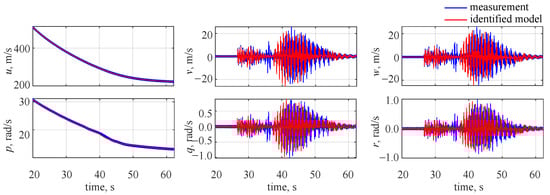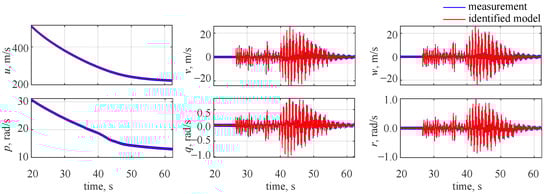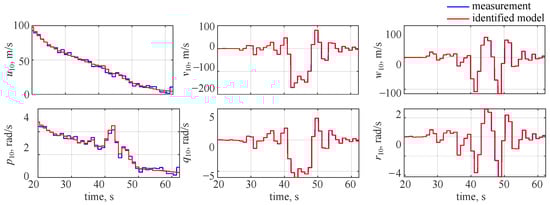 The identified and measured wavelet coefficients at the 10th level are shown in Figure 7, where blue lines denote the decomposed measured outputs and red lines stand for the estimated model. It can be seen that a very good visual match is observed and the only noticeable discrepancies can be seen for longitudinal velocity u and roll rate p. This comes from the fact that less variability was observed in those two flight parameters: the missile was flying at high velocity and spinning along the longitudinal axis with a significant roll rate. Thus, the reaction due to gasodynamic control was much less visible in the longitudinal velocity and roll rate.