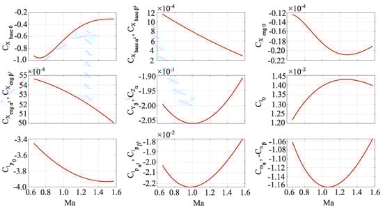 Finally, the estimated aerodynamic coefficients as a function of their Mach number are shown in Figure 10. It can be seen that it would be possible to use lower-order polynomials for estimating some aerodynamic coefficients (engine derivatives depending on the aerodynamic angles). However, one has to have in mind that this would drop the accuracy level.