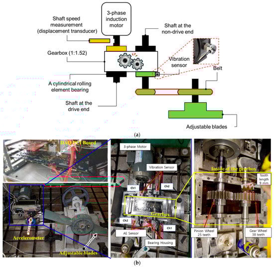 Figure 2 depicts the experimental test equipment used to obtain vibration data from a gearbox system. The functional structure of the test rig is shown in Figure 2a; the gearbox transfers rotational motion from a three-phase motor to adjustable blades (i.e., the load) through a 1:1.52 reduction ratio. The non-drive shaft is used to connect the load and a gear wheel. The driveshaft connects the pinion wheel directly to the three-phase motor. The pinion wheel and gear wheel are engaged by the teeth (each tooth is 9 mm in length), as indicated in Figure 2b. The vibration sensor is positioned at the non-drive end to monitor the vibration characteristics of the gearbox. The displacement transducer is mounted on the driveshaft to track the rotational speeds of the pinion wheel. The vibration dataset in this study was collected using a PCI-based data acquisition device that digitizes vibration signals from the accelerometer. Table 1 summarizes the specifications for the vibration sensor, transducer, and acquisition board.