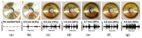 Real-world gearbox systems suffer two major sorts of gear failures: those induced during manufacture or installation (e.g., incorrect tooth sketching, wheel alignment, or parallelism) and those that occur during operation (e.g., tooth pitting, tooth spalling, tooth cracking, tooth breakage). Gear failures were simulated in this testbed by cutting one tooth with several degrees of tooth length (9 mm) to generate multi-degree tooth cut failures of 6.6% (0.6 mm), 10% (0.9 mm), 20% (1.8 mm), 30% (2.7 mm), 40% (3.6 mm), and 50% (4.5 mm), as shown in Figure 3. These failures were generated to approximate the operational problems that occur in actual gearbox systems as a result of long-term rotational performance fatigue.
