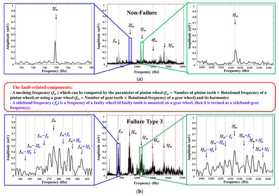 The frequency spectrum analysis of vibration samples acquired from the non-failure (a) and failure type 3 (b) conditions at 900 RPM.