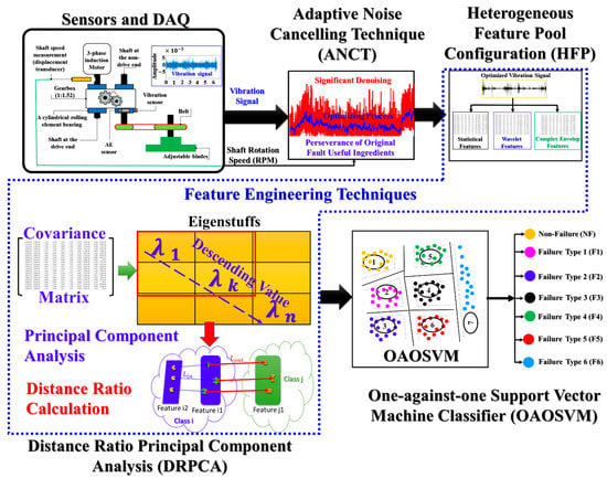 - To reduce the dimensionality of the feature pool and select the most discriminative features for identifying the MTCF faults, a novel feature selection method, DRPCA, was proposed. DRPCA combines principal component analysis with relative distance ratio analysis of features of different fault types. The optimal feature set is constructed by selecting features with the highest relative distance ratio. This provides lower dimensionality, thereby improving the diagnostic performance of the OAOSVM, which was employed as a classifier.
