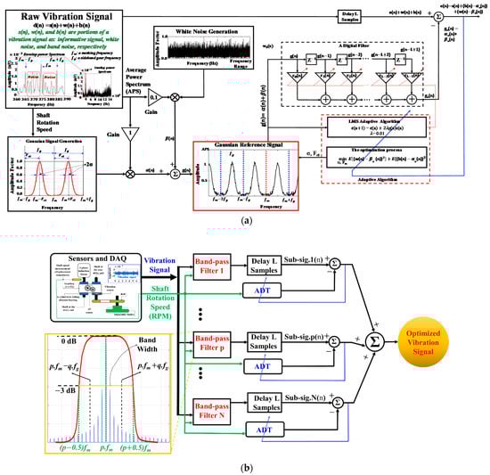 The ANCT is based on the adaptive noise filtering technique outlined in Section 2 and is used to reduce the noise and redundancy of a vibration signal. Accordingly, the raw signal input is the vibration signal, and the reference signal is composed of the signal that simulates the noise oscillations in a gearbox vibration signal, termed the noise-pretended signal (NPS) (Figure 1). Two essential steps operate in the ANCT: the generation of NPSs and the execution of adaptive algorithms to access and reduce noise in multiple segments of the vibration frequency domain. The adaptive denoising techniques (ADTs) developed and verified in [18,19,33] have shown outstanding results in removing noise and protecting the failure-related signal. The noise in the gearbox vibration signal is categorized into two forms using those methods: white noise caused by the measuring system (e.g., data acquisition systems, electronic devices) and waveband noise induced by unrelated mechanical component resonances. Thus, as shown in Figure 6a, the NPS is formed by combining two functions of a uniform random distribution to emulate white noise and a Gaussian distribution to imitate the analogous behavior of waveband noise. Additionally, the parameters (i.e., mean and standard deviation) of the Gaussian signal, which are functions of the rotating speed variable, are associated with filter weights to be adjusted by the LMS adaptive algorithm [19]. The following formula describes the Gaussian function part of the NPS: