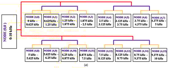 Using Equations (5)–(7), WPT decomposes each node into two sub-bands using high- and low-pass filters formed by the wavelet packet coefficients. Each coefficient is the specific parameter for each resolution in the frequency domain and thus represents the scaling parameter and oscillation component in the observed signal.