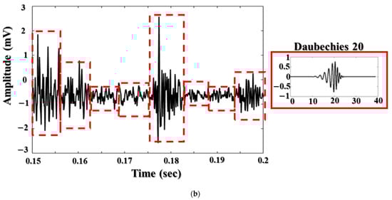 where and are the transition and scale parameters, respectively. The scaling and mother wavelet functions are assigned as n = 0 (), and n = 1 (), respectively. Here, and are a scaling function and a wavelet function that form the multi-resolution analysis technique in WPT. The scaling function represented by the low-pass filters is used to analyze the input signals in the low-resolution approximation spaces, while the wavelet function is applied to refine those approximation spaces in the higher frequency zones, implemented by the band-pass filters [36].