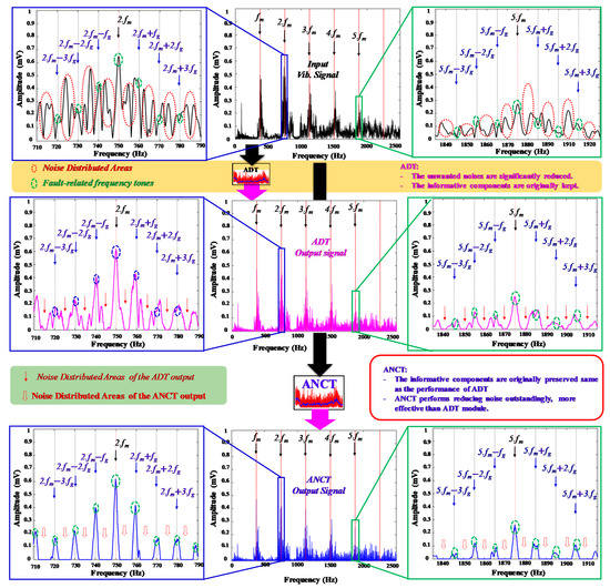 - Vibration signals acquired from gearboxes have noisy components that dominate and distort the failure-related signal information, such as meshing frequency harmonics and sideband frequencies. To extract this information, a novel adaptive noise reduction method, ANCT, was proposed. ANCT uses an adaptive method to identify the appropriate Gaussian parameters for each segment of the vibration frequency domain. ANCT significantly reduces the noise in the vibration signal while retaining maximal failure-related information.