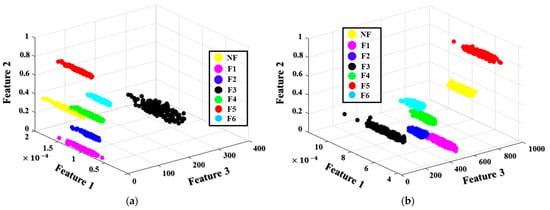 where is the Euclidian distance between two feature vectors; is the total number of features (, the dimension of the HFP); denotes the number of failure types ( = 7); and signifies the observed sample count for each failure type. From Equation (19), is stated in the range of [0, 1] and enlarges as increases and decreases. This tendency indicates the specification of discriminative features because it results in less variation within a single failure type and much higher variation across different types.