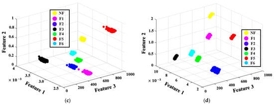 The applied diagnostic model uses a novel DRPCA procedure to capture the most discriminant features from the HFP in a smaller dimension. The PCA technique, as discussed in Section 2.4, is used to identify the importance of dynamically connected parameters or principal components, represented by a covariance matrix of eigenvectors. The PCA approach was used in this experiment to identify the attributes that produce primary elements with an eigenvalue greater than 80%. This value was chosen to capture the informative features that associated with the first 30 principal components, whose eigenvalues were greater than the remainder of the components. Experimental assessments in [28,50] reveal that the features with the greater eigenvalues contain the most fault-related information in the sequence of the all input features. The resulting principal components are then estimated using the distance ratios (according to the process given in Section 4.3). As a result of computing the DRPCA, features with substantial distance ratios () are selected as the most discriminative features. The new optimal feature set is composed of three outcome features (designated Feature 1, Feature 2, and Feature 3), which resulted from a statistic model, wavelet decomposition, and complex envelope analysis, respectively. In Figure 9, a 3D figure based on those three optimal features illustrates the spatial distribution zones of samples of the seven MTCF failure states under the four different rotation speeds. As shown in Figure 9, the samples belonging to the same category are clustered together, and the samples belonging to different fault types are clearly separated in the feature space. The distance ratio thresholds are experimentally selected to obtain the number of the resultant features that are capable of representing failure types separately. The visualized spatial distribution of the categories in Figure 9 demonstrates that the threshold () is an appropriate selection for configuring the optimal feature subset of the most discriminative features in this study. The DRPCA output is then used as the input data for the OAOSVM classifier, which categorizes the data according to the failure types (i.e., NF, F1, F2, F3, F4, F5, and F6).