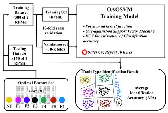 DRPCA configures a feature set of the most distinct features, which is then used as input data for machine learning–based classification. Compared with other artificial intelligence techniques, support vector machines (SVMs) have higher generalization, allowing them to diagnose mechanical defects in a rotating machine with high accuracy [30]. SVMs can also effectively separate nonlinear datasets using hyperplane mapping functions [31]. To classify multiclass data, SVMs use the one against one, one against all, or hierarchical strategies. The most accurate approach is a one against one SVM (OAOSVM) [32], which we thus use in our proposed model.