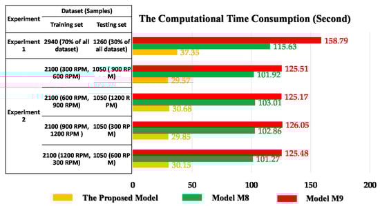 Visual expression of the computational time in the comparison of three models: the proposed model, M8, and M9.