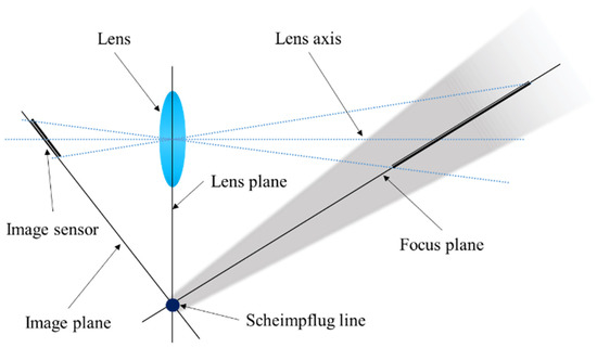 Scheimpflug principle in a 2D view, where gray shade represents DOF.