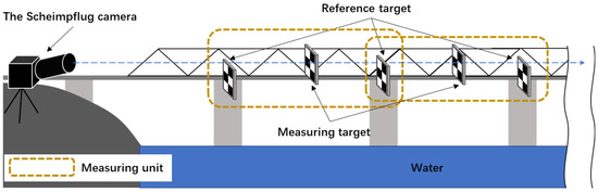 The Scheimpflug principle states that the focus plane (the plane on which the camera is focused), thin lens plane and image plane intersect in a single line, which is called the Scheimpflug line (Figure 2). In this case, the DOF of the camera is extended. Based on this principle, a robust, high-precision and low-cost displacement measurement system was designed in this study, which can clearly observe all measurement points distributed along the depth direction in a single-camera view with high magnification. The system contains a Scheimpflug camera, a tripod, laptop PC for camera control and several targets; their placement in bridge monitoring is illustrated in Figure 3. The Scheimpflug camera was installed at a stable area in front of the bridge, and each target was installed outside the bridge for its pattern to face the longitudinal direction of the bridge. The pattern of the target had two cross-shaped corners; thus, the scale conversion factors (mm/pixel) could be calculated easily. The distribution of the Scheimpflug camera and all targets were approximately in a line. The target installed on the stable platform (usually the pier) of the bridge was used as a reference for compensating camera motions. To facilitate the description of the algorithm in Section 2.2.2, the reference targets on two adjacent piers and the measuring targets between them were defined as a measuring unit, as shown in Figure 3.