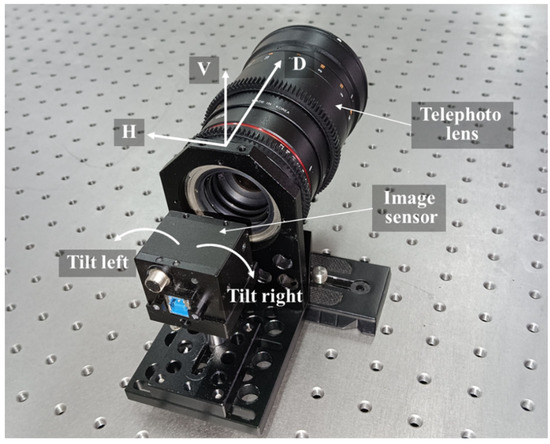 The Scheimpflug camera used in this study includes three components: an 8-bit CMOS sensor employed to record the target images, which has a spatial resolution of 4096 × 2160 pixels; a telephoto lens (focal length 135 mm); and a custom-made Scheimpflug adapter. The adapter was machined by a computer numerical control (CNC) system, which can tilt the sensor around the vertical axis, with a range of approximately ±10°. The expense of the Scheimpflug adapter is only $100. The horizontal (H), vertical (V) and depth (D) directions of the Scheimpflug camera are defined as shown in Figure 4.