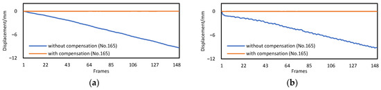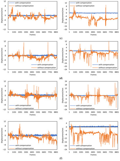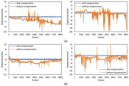 The root mean squared errors (RMSEs) with and without compensation were calculated, and are listed in Table 1. After implementing the motion compensation method, the RMSEs in the x and y directions did not exceed 0.54 mm, which were reduced by at least 62% and 92%, respectively. It can be observed from Table 1 that the reductions of RMSEs in the y direction were overall higher than those in the x direction, which is because the self-weight of the camera and ground vibrations were more likely to cause the camera’s movement in the y direction. In addition, the increase in the camera–target distance reduced the image resolution and localization accuracy of the targets, resulting in a worse correction to motion-induced errors.
