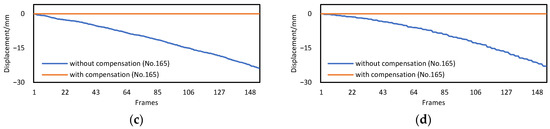 Since targets 105 and 285 were reference targets whose displacements defaulted to zeros, and the measurements of target 225 were highly consistent with those of target 165, only the displacement of target 165 is plotted in Figure 10. In the first two acquisitions, the translation of the camera was close to 10 mm, while in the last two acquisitions, the rotation of the camera exceeded 1°, and caused a displacement error of more than 25 mm. After the compensation, the maximum errors of the four results did not exceed 0.01 mm.