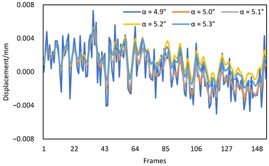 Considering that the resolution of the Scheimpflug adapter was only 0.1°, five different tilt angles {4.9°, 5.0°, 5.1°, 5.2°, 5.3°} were used to verify the influence of the adapter resolution on camera motion compensation. Taking the third acquisition as an example, the corrected displacements of target 165 obtained with different tilt angles are shown in Figure 11.