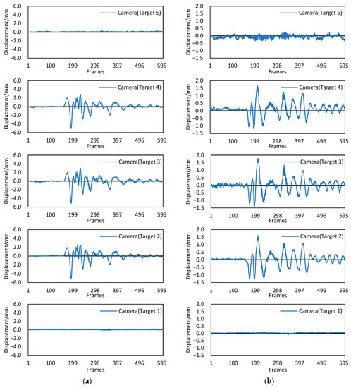 - The camera must be installed close to the bridge. In Figure 15c, the shortest distance between the camera and the bridge model is approximately 1.0 m, and only such a short distance can ensure that all targets can be collected in a narrow camera view. However, when monitoring actual bridges, there may be insufficient installation space in front of the bridge.