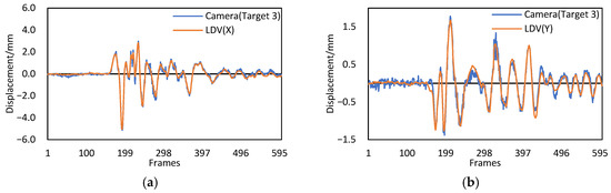 Comparison of the displacements with the Scheimpflug camera and LDV. (a) Displacements in the x direction. (b) Displacements in the y direction.