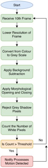 Software used in the camera trap first begins with initialization of peripherals and ports on all four cores. As the RPi contains four cores, the software designates appropriate tasks to each core. This is illustrated in Figure 3, the software flowchart. Core 1 is used for video frame capture and recording of video. Once the video frame capture has commenced, it notifies other threads and processes that video capture has begun. The first 10 frames are sent to Core 2, the video analysis core. Core 2 then begins its process of discarding the first 9 frames it receives and retaining the 10th frame, where it then applies the motion detection algorithm to this frame (see Figure 2 for motion detection algorithm). The motion detection algorithm first lowers the resolution of the 10th frame, converts it to greyscale, applies background subtraction to the frame, then applies morphological opening and closing to the frame where opening removes small objects from the background and closing removes small holes in the foreground, followed by removing grey shadow pixels, and finally counts the number of white pixels. The algorithm can then determine if motion has been detected by comparing the change in the number of white pixels with a threshold value. If motion has been detected, Core 2 alerts other cores to begin processes reliant on motion detection, including storing video frames into a buffer and sending the buffer to thread 2 of Core 1 (see Figure 4a,b for two examples of footage demonstrating frames that would and would not pass as detected motion). Figure 4c shows a bird captured in good light conditions.