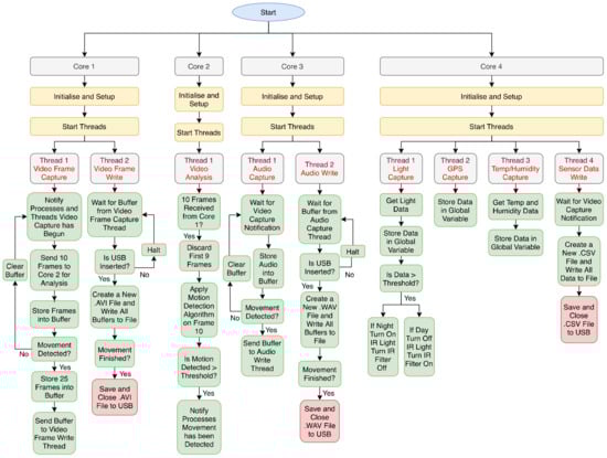 The thread first checks if a USB memory is connected; otherwise, it will shut down the RPi. If connected, the thread creates an AVI file where the sent video buffers are stored. Once Core 2 determines that motion has stopped, thread 2 of Core 1 closes the AVI file and saves it to the USB memory. Core 3 is used for audio capture and storage of audio. Once Core 1 has alerted that video capture has begun, the audio capture thread stores audio into a buffer; if no motion is detected, the buffer is cleared. Otherwise, the buffer is sent to thread 2 of Core 3. Thread 2 checks if a USB memory is connected; otherwise, it will shut down the RPi. If connected, the thread creates a WAV file where the sent audio buffers are stored. Once Core 3 determines that motion has stopped, thread 2 of Core 3 closes the WAV file and saves it to the USB memory. Core 4 is used for data collection of sensors. Thread 1 is used for capturing the light sensor data. Once light sensor data have been captured, they are stored in a global variable of the RPi. If the light data are above a threshold, the RPi turns on the IR light and opens the IR filter (if low light conditions) or turns off the IR light and closes the IR filter (if good light conditions). Thread 2 of Core 4 captures GPS data and stores them in a global variable. Thread 3 of Core 4 captures the temperature and humidity data and stores them in a global variable. Thread 4 waits for Core 1 to alert that video capture has begun; then, it creates a CSV file where it stores all sensor data and saves them to the USB memory.
