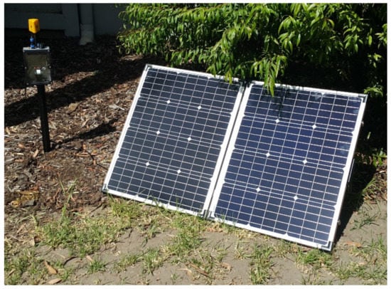 A solar system was used to power the camera trap. This solar system was composed of a 100-watt folding monocrystalline solar panel, 9-amp-hour (aH) sealed lead-acid (SLA) battery, solar charge controller, and an acrylonitrile butadiene styrene (ABS) enclosure. All necessary wiring was correctly rated for electrical specifications of the camera trap and outdoor ratings.