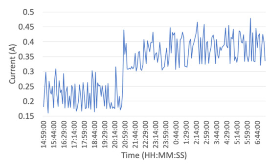 Experiment 1 examined the power consumption of the camera trap over 24 h, with 16 h of results shown in Figure 8. Due to the memory overflow of our datalogger, we could not access the rest of the results. A power increase occurs around 9 pm due to the camera trap entering night mode, where turning on the IR LED is done to illuminate the camera’s viewing area. Table 1 and Table 2 show the results of these tests with peak and average power and current consumption determined through good light conditions, where sunlight was present, and low light conditions, where sunlight was not present. Comparing these results to prior related works, previous attempts using similar components show an average current consumption of 230 mA [30]. In contrast, our system achieved an average of 221 mA current consumption under the same conditions, with even lower power consumption to be implemented in the future along with better optimization of hardware and software. Using a lower power LED could further reduce the power consumption; however, this may impact night-time image collection. The majority of the power consumption from our system was from writing files to the USB memory.