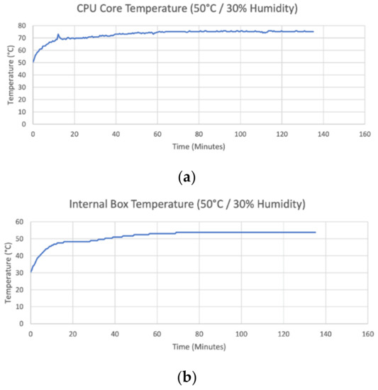 Experiment 3 results from environmental chamber testing of the camera trap. (a) CPU temperature with environmental chamber at 50 °C and 30% humidity. (b) Internal box temperature with environmental chamber at 50 °C and 30% humidity.