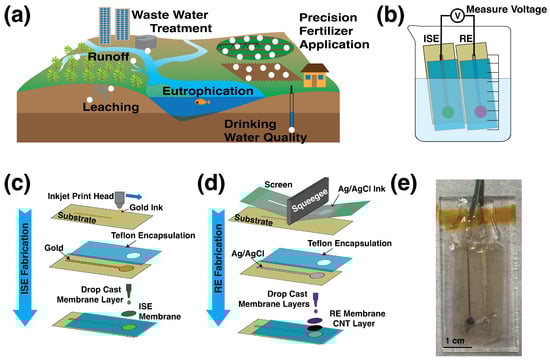 (a) Printed sensors could be widely deployed to map nitrate from fertilizer application to runoff. (b) The potential difference between the printed ion-selective and printed reference electrodes is determined by the nitrate concentration in the solution, and this potential is read as the sensor’s output. (c) Ion-selective electrodes are made by inkjet printing gold onto a substrate, and encapsulating the trace with a teflon tape. The membrane solution is drop-cast onto the exposed area of the electrode. (d) Reference electrodes are made by screen printing Ag/AgCl ink onto the substrate, and the trace is encapsulated with teflon. The carbon nanotube transducing layer is drop-cast first, followed by the PVB/salt membrane. (e) A fully printed sensor mounted on acrylic backing and with wires attached is ready for use in soil tests.
